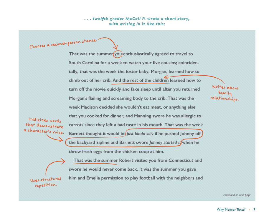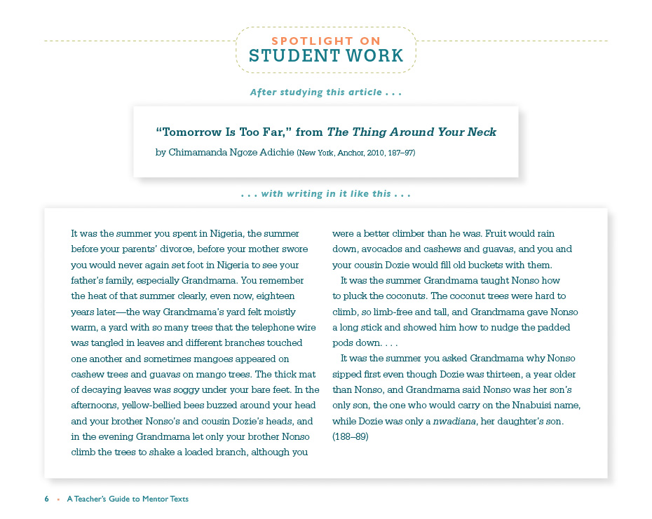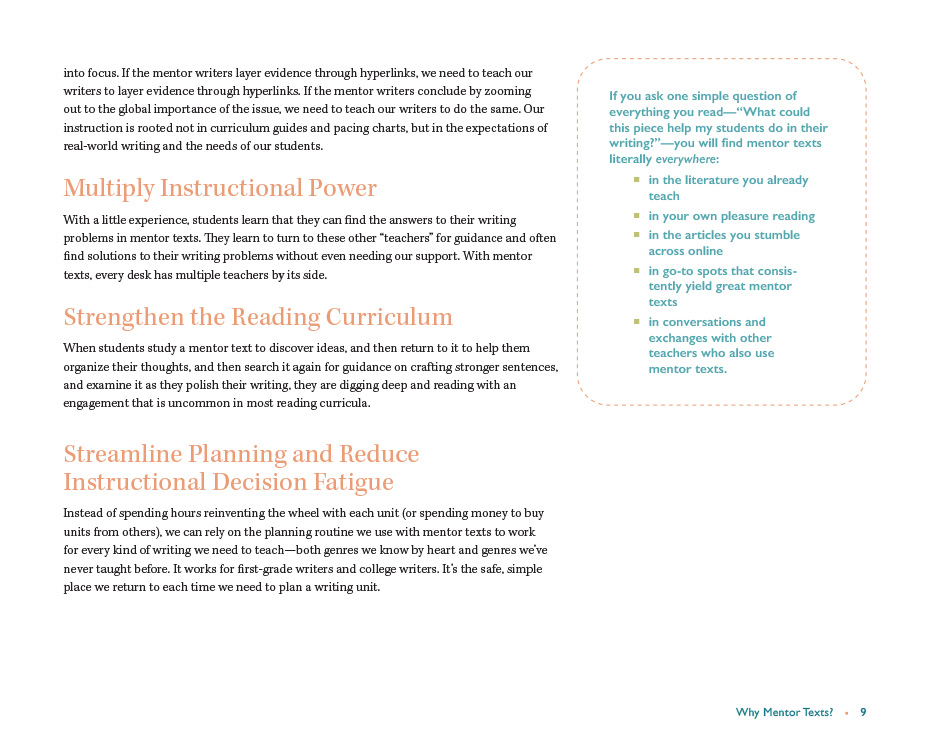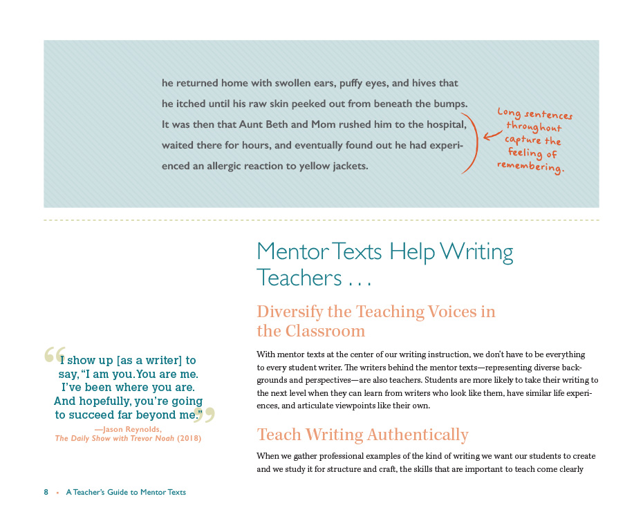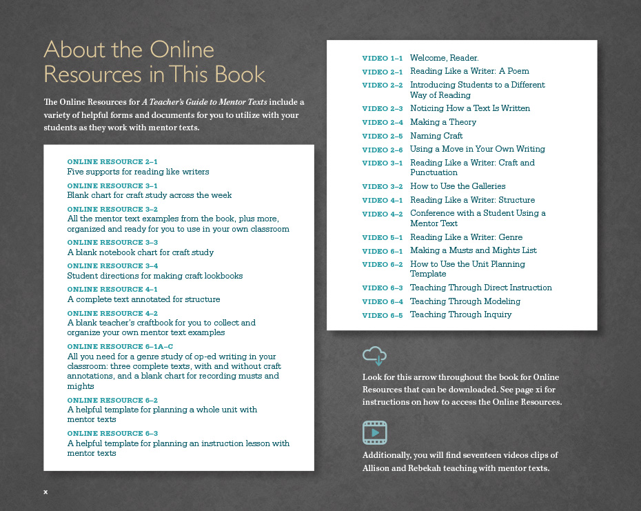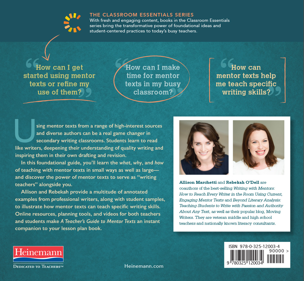 Using mentor texts from a range of high-interest sources and diverse authors can be a real game changer in secondary writing classrooms. Students learn to read like writers, deepening their understanding of quality writing and inspiring them in their own drafting and revision. In this foundational guide, you’ll learn the what, why, and how of teaching with mentor texts in small ways as well as large—and discover the power of mentor texts to serve as “writing teachers” alongside you. Allison and Rebekah provide a multitude of annotated examples from professional writers, alongside student samples, to illustrate how mentor texts can teach specific writing skills. Online resources, planning tools, and videos for both teachers and students make A Teacher’s Guide to Mentor Texts an instant companion to your lesson plan book.