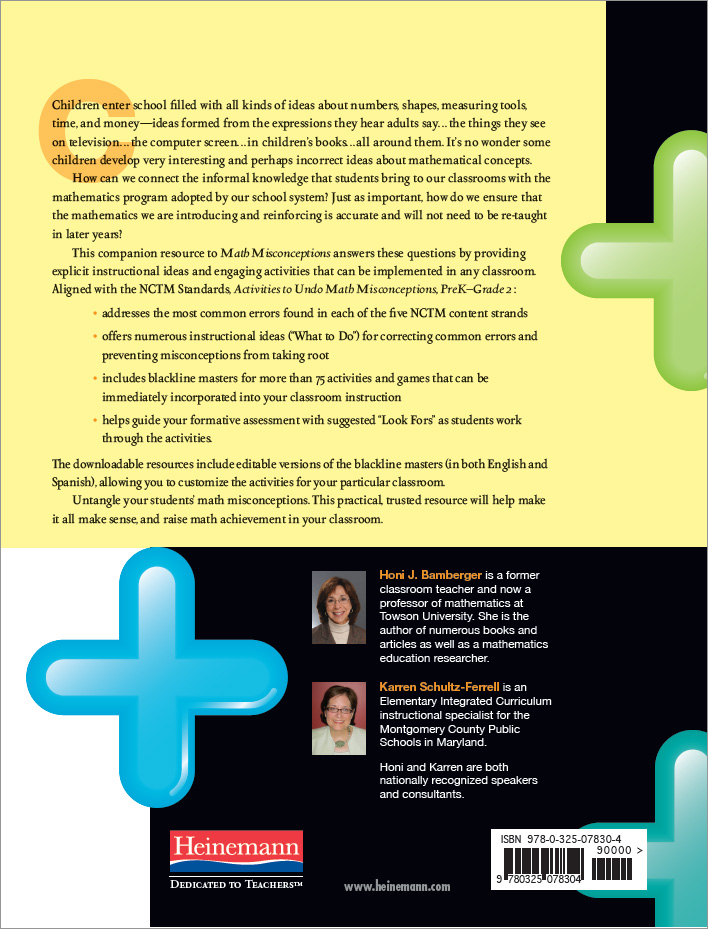 A companion resource to Math Misconceptions, Activities to Undo Math Misconceptions provide explicit instructional ideas and engaging activities that can be implemented in any classroom. Aligned with the NCTM Standards, this practical guide includes classroom vignettes and problem-based situations that provide additional insight into the misconception or error pattern that is being described.  Relevant research is offered as well as a range of time-saving instructional suggestions.