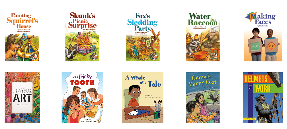 • 10 original titles (6 copies of each title) at text level L on the F&P Text Level Gradient™: Painting Squirrel's House; Skunk's Picnic Surprise; Fox's Sledding Party; Water for Raccoon; Making Faces; Playful Art; One Tricky Tooth; A Whale of a Tale; Emma's Furry Coat; Helmets at Work
