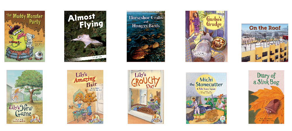• 10 original titles (6 copies of each title) at text level J on the F&P Text Level Gradient™: The Muddy Monster Party; Almost Flying; Horseshoe Crabs and Hungry Birds; Garbo's Grudge; On the Roof; Lily's New Game; Lily's Amazing Hair; Lily's Grouchy Day; Michi the Stonecutter: A Tale from Japan; Diary of a Stink Bug