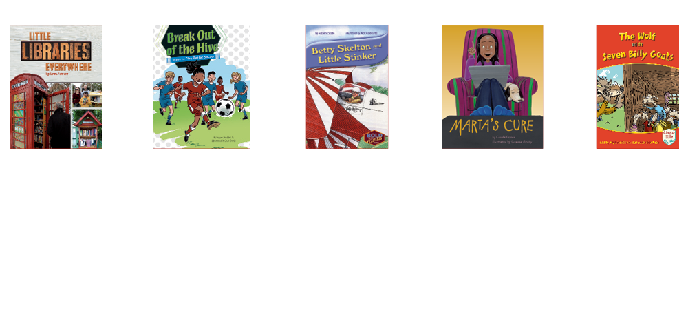 • 5 original titles (6 copies of each title) at text level N on the F&P Text Level Gradient™: Little Libraries Everywhere; Break Out of the Hive: Ways to Play Better Soccer; Betty Skelton and Little Stinker; Marta's Cure; The Wolf and the Seven Billy Goats