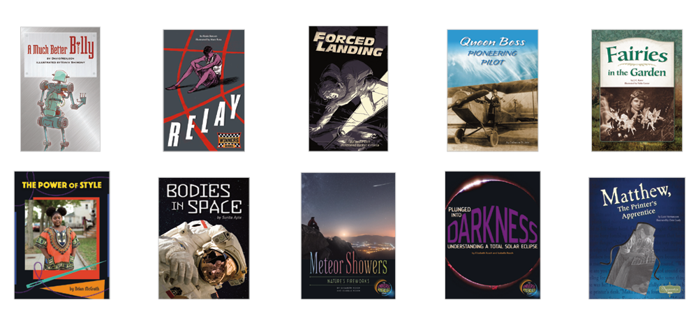 • 10 original titles (6 copies of each title) at text level U on the F&P Text Level Gradient™: A Much Better Billy; Relay; Forced Landing; Queen Bess: Pioneering Pilot; Fairies in the Garden; The Power of Style; Bodies in Space; Meteor Showers: Nature's Fireworks; Plunged into Darkness: Understanding a Total Solar Eclipse; Matthew, The Printer's Apprentice