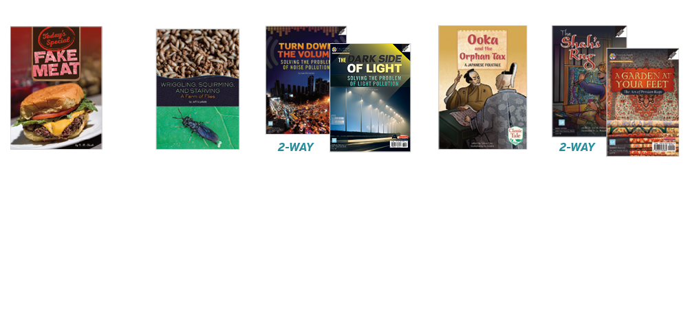 • 5 original titles (6 copies of each title) at text level W on the F&P Text Level Gradient™: Today's Special: Fake Meat; Wriggling, Squirming, and Starving: A Farm of Flies; Turn Down the Volume: Solving the Problem of Noise Pollution / The Dark Side of Light: Solving the Problem of Light Pollution (two-way book); Ooka and the Orphan Tax: A Japanese Folktale; The Shah's Rug / A Garden at Your Feet: The Art of Persian Rugs (two-way book)