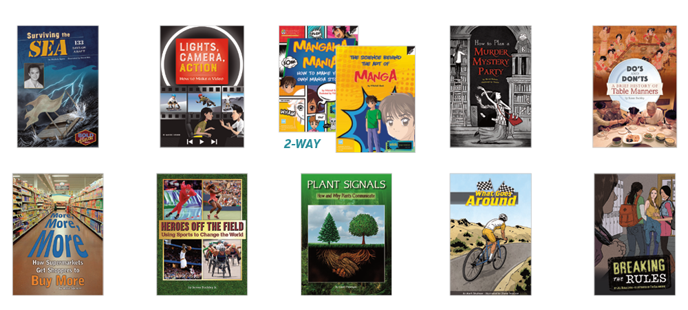 • 10 original titles (6 copies of each title) at text level W on the F&P Text Level Gradient™: Surviving the Sea: 133 Days on a Raft; Lights, Camera, Action: How to Make a Video; The Science Behind the Art of Manga / Mangaka Mania: How to Make Your Own Manga Story (two-way book); How to Plan a Murder Mystery Party; Do's and Don'ts: A Brief History of Table Manners; More, More, More: How Supermarkets Get Shoppers to Buy More; Heroes Off the Field: Using Sports to Change the World; Plant Signals: How and Why Plants Communicate; What Goes Around; Breaking the Rules