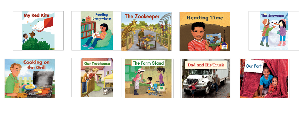 • 10 original titles (6 copies of each title) at text level B on the F&P Text Level Gradient™: My Red Kite; Reading Everywhere; The Zookeeper; Reading Time; The Snowman; Cooking on the Grill; Our Treehouse; The Farm Stand; Dad and His Truck; Our Fort