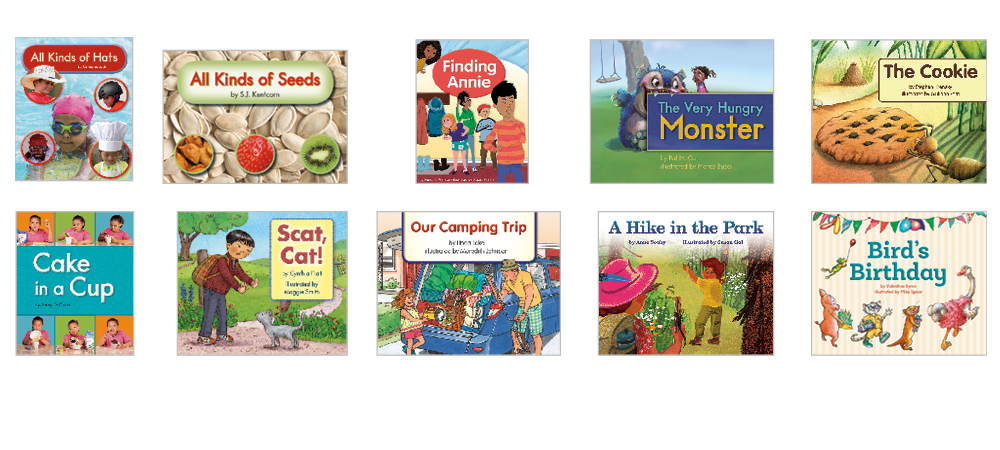 • 10 original titles (6 copies of each title) at text level D on the F&P Text Level Gradient™: All Kinds of Hats; All Kinds of Seeds; Finding Annie; The Very Hungry Monster; The Cookie; Cake in a Cup; Scat, Cat!; Our Camping Trip; A Hike in the Park; Bird's Birthday