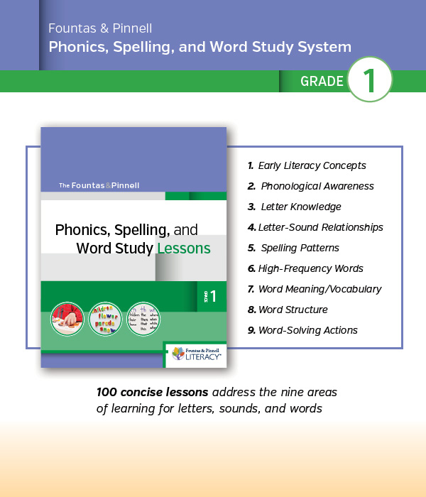 Phonics, Spelling, and Word Study Lessons, Grade 1, provides 100 concise lessons driven by clear language principles from The Fountas & Pinnell Comprehensive Phonics, Spelling, and Word Study Guide. The lessons help children attend to, learn about, and efficiently use sounds, letters, and words out of text and as they read and write. Phonics, Spelling, and Word Study Lessons, Grade 1 also includes features that enable you to plan and teach efficiently and systematically: