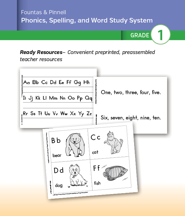 - Ready Resources – Ready-to-use, pre-printed materials for Phonics, Spelling, and Word Study Lessons. Ready Resources in Grade 1 includes items such as word lists, posters, categorized, general pocket-chart cards for tailoring lessons, lesson-specific pocket-chart cards, and blank, dry-erase pocket-chart cards. All Ready Resources items can be found in the Ready Resources shipper box.
