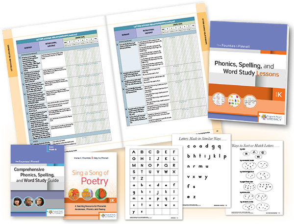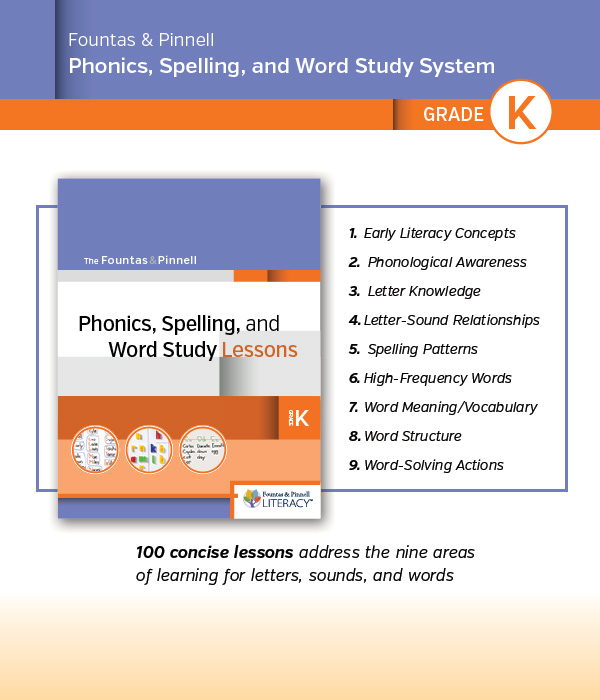 - Organization by nine areas of learning—Early Literacy Concepts, Phonological Awareness, Letter Knowledge, Letter-Sound Relationships, Spelling Patterns, High-Frequency Words, Word Meaning/Vocabulary, Word Structure, and Word-Solving Actions