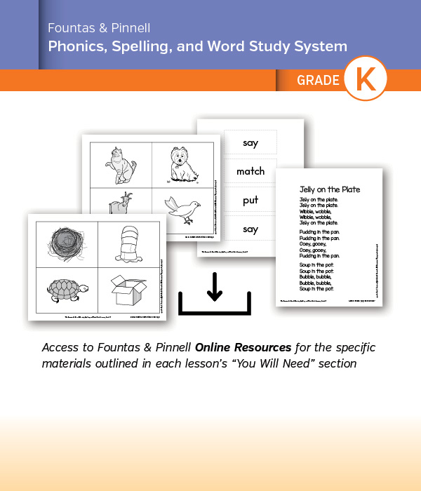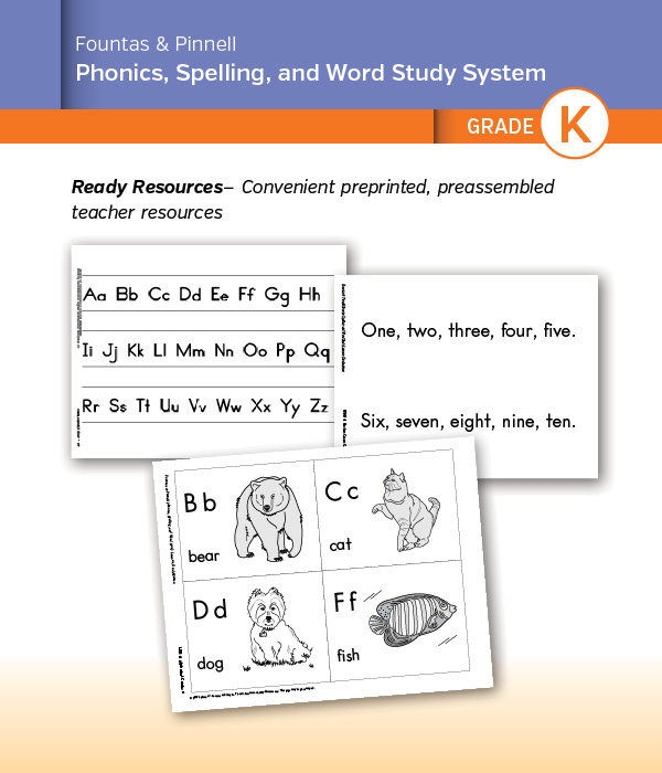 - Ready Resources – Ready-to-use, pre-printed materials for Phonics, Spelling, and Word Study Lessons. Ready Resources in Grade K includes items such as word lists, posters, categorized, general pocket-chart cards for tailoring lessons, lesson-specific pocket-chart cards, and blank, dry-erase pocket-chart cards. All Ready Resources items can be found in the Ready Resources shipper box.