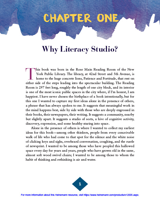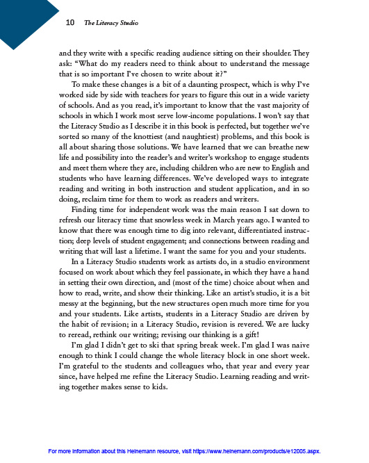 Enter the Literacy Studio, an alternative workshop model that combines reading and writing. It’s a way of teaching that makes sense to kids –with more time for choice, independent reading and writing, small group work, and conferring. The Literacy Studio defines and describes this new model and makes clear, through lesson samples, student work, and conversations with teachers just how much more efficient and effective literacy learning is when students see themselves as writers who read and readers who write.