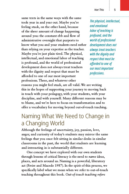 This book is an invitation to learn and grow alongside the suggestions and research presented. It offers guidance for more meaningful teaching in the present, and critical pedagogy for transforming classrooms for the societies of the future.
