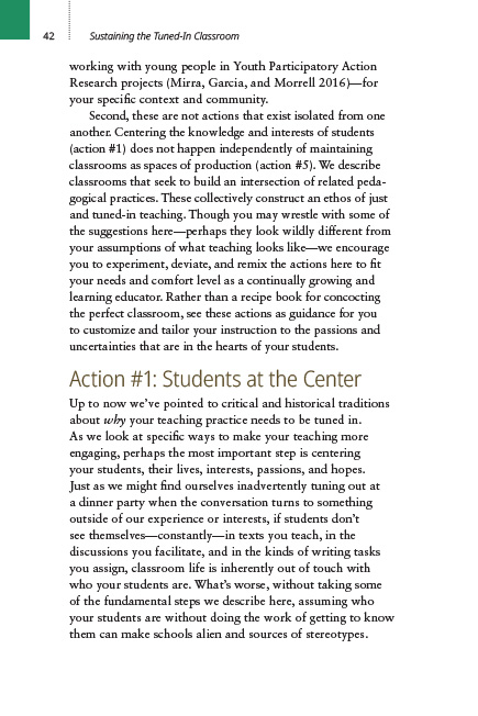 In Tuned-in Teaching, Antero Garcia and Ernest Morrell offer a road map for creating a classroom that is transformative for your students and revitalizing for you. They explain why students play an integral role in turning classrooms into spaces for greater engagement and innovation. By tuning in to youth culture and the lives of students, we become more connected to their needs and ways of learning.