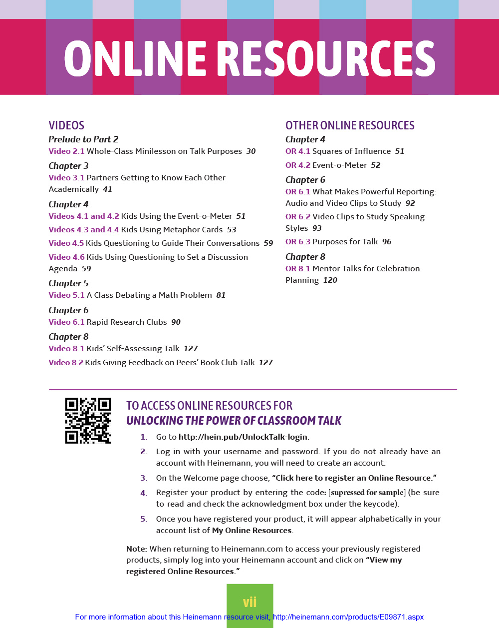 They offer a clear description of each purpose, the “when and how” to teach into those purposes, and what to do when things go awry. Classroom video brings the content to life showing what the talk looks and sounds like in action.