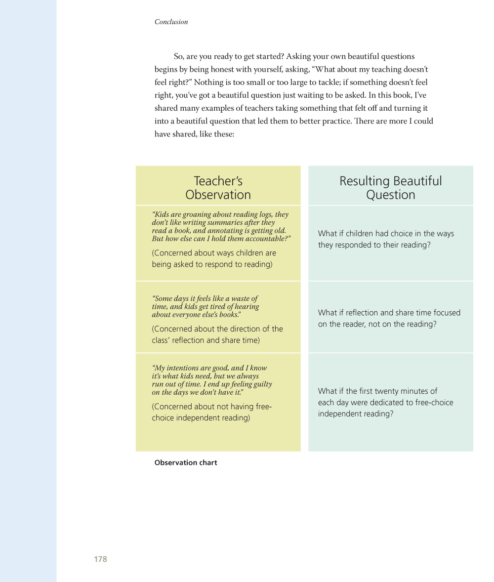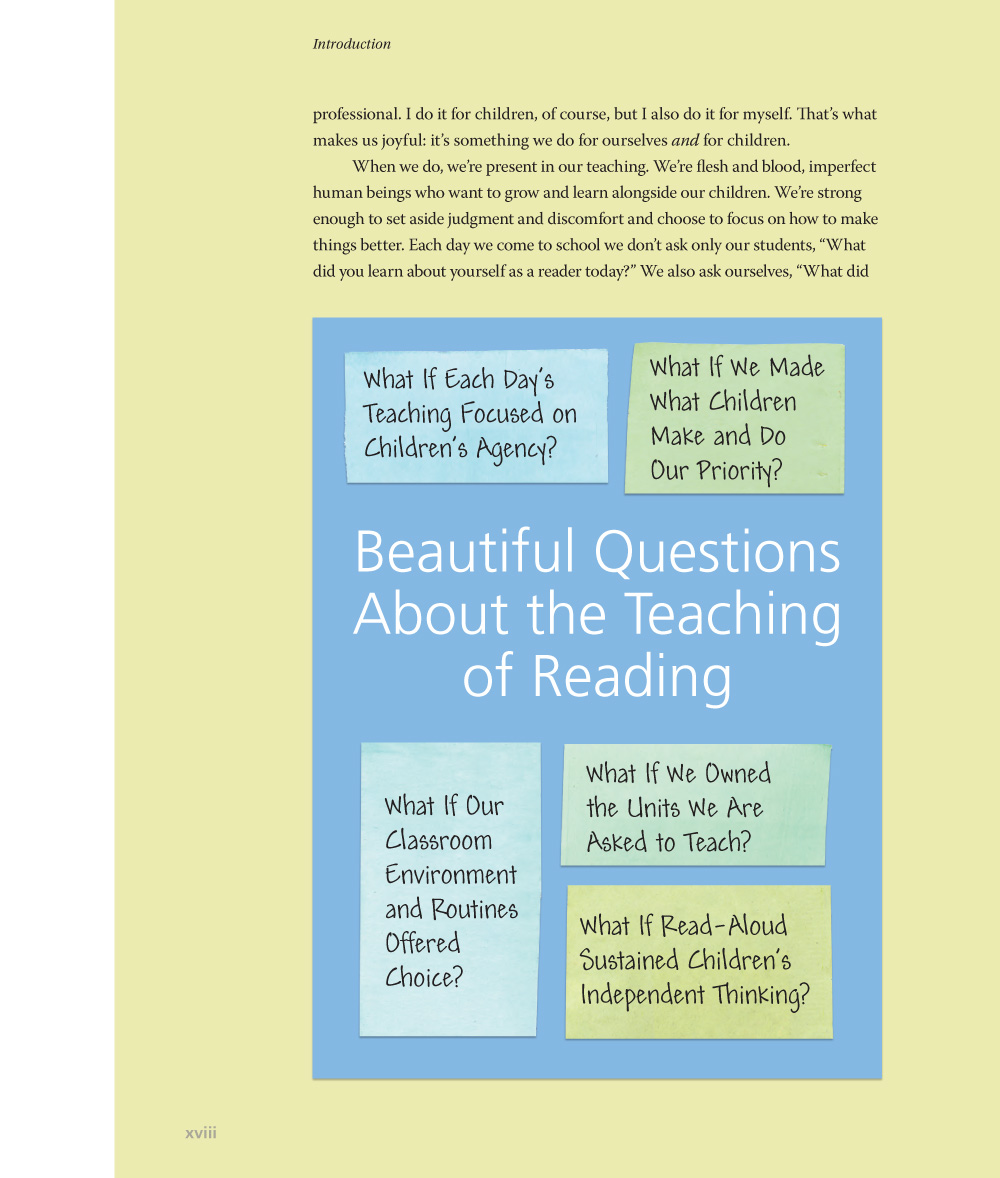 Asking questions leads to opportunities—it’s about growth, openness, and a willingness to change, which top-down models don’t allow. It’s a way for us to focus our thinking and be present in the lives we’ve chosen to live. Asking the question is the essential behavior of teaching. It’s not a perfect call-and response but a messy business of wondering, stumbling, and figuring things out. It requires bravery and commitment, but that’s what teaching is. It’s a joyful, creative, purposeful profession. If you feel you’ve lost even some of your passion for teaching, I would love to help give it back to you. So, in this book, we’ll talk about creating beautiful questions about the teaching of reading. To help you take on the process of asking beautiful questions, I’ll share how I got to some beautiful questions about teaching reading and what I did with them as I worked with teachers in classrooms across the country.