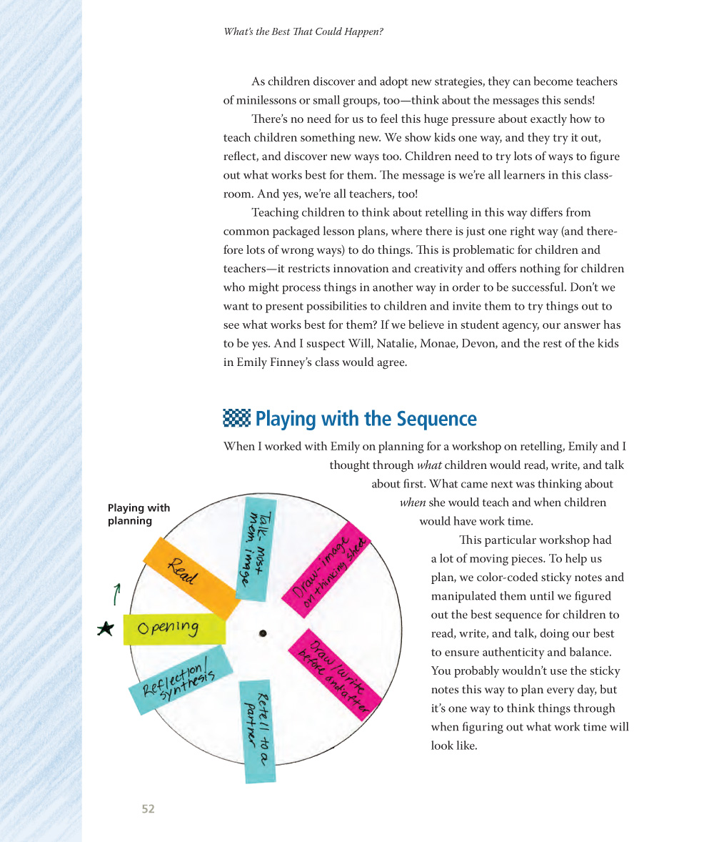 This book is about owning our teaching and making decisions based on who we are and what’s best for the children in our classroom today. That all sounds ambitious and brave… and the work is—teaching is—but it happens in so many small and simple ways. My wish is for you to think about what you do and ask your own beautiful questions, so that you and your children can thrive and view yourselves and each other as valuable, idea-filled, creative, and contributing humans who own your teaching and learning. Be open and receptive to possibilities! Think: “What if we did it this way?”