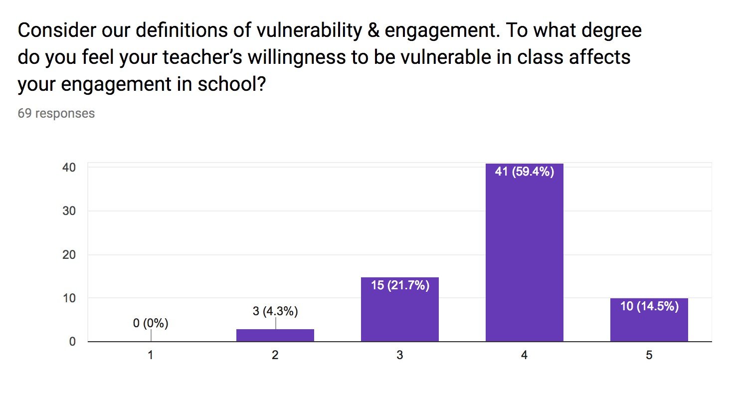 Early in the school year, after introducing vulnerability and engagement, I administered a survey designed to track our evolution in all three domains of vulnerability. Part of the survey included three short-answer questions, one for each dimension of vulnerability. The survey also asked students about the relationship between teacher vulnerability and engagement, which I will examine in future blogs. What follows is a sampling of student responses followed by data highlighting their answers to scaled questions.