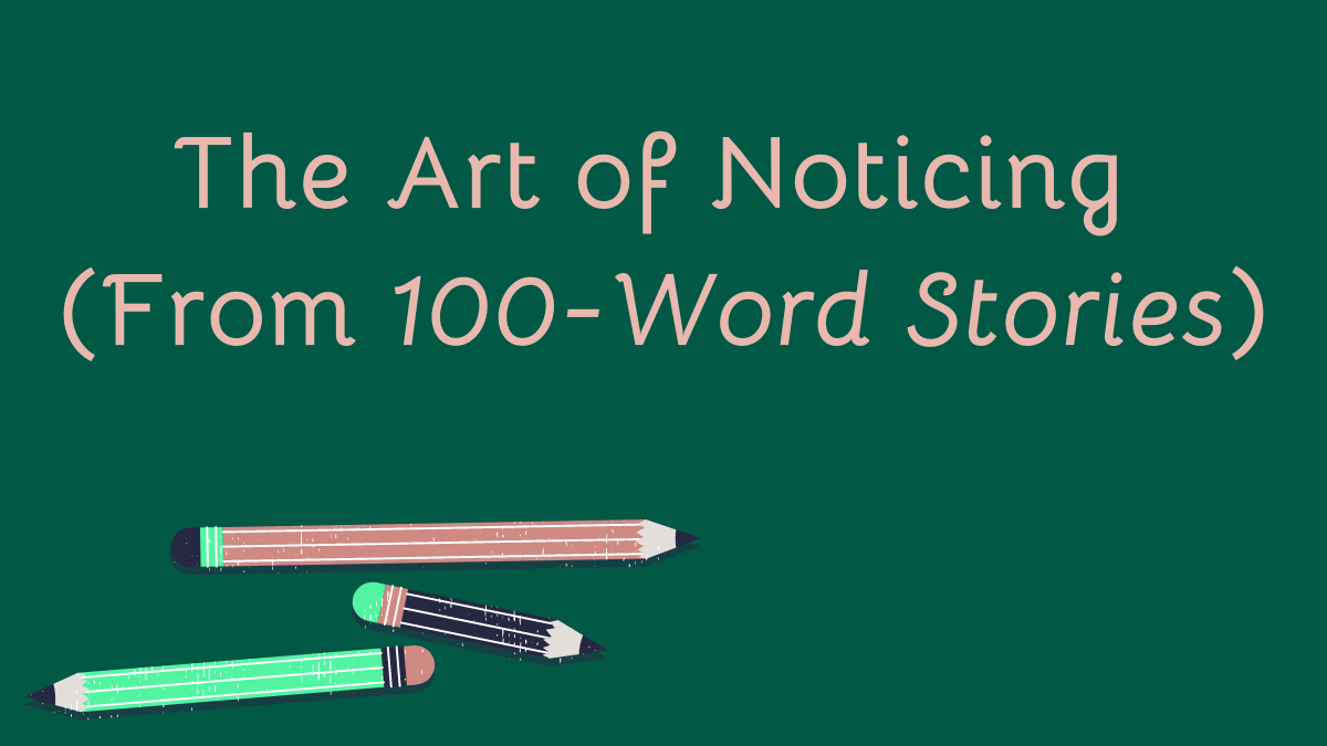 I like to tell my students that in all writing (not just with this form, but with all writing), a writer is always “noticing.” We are noticing the specific senses that allow us to experience our world; we are noticing the way people interact with each other, the way they speak to each other (or don’t); we are noticing all the small, bright specific things that make our world beautiful and interesting and heartbreaking. This noticing (and the specific choices we make because of it) allows us to create unique, vibrant worlds in small spaces, and these worlds begin at the sentence level.