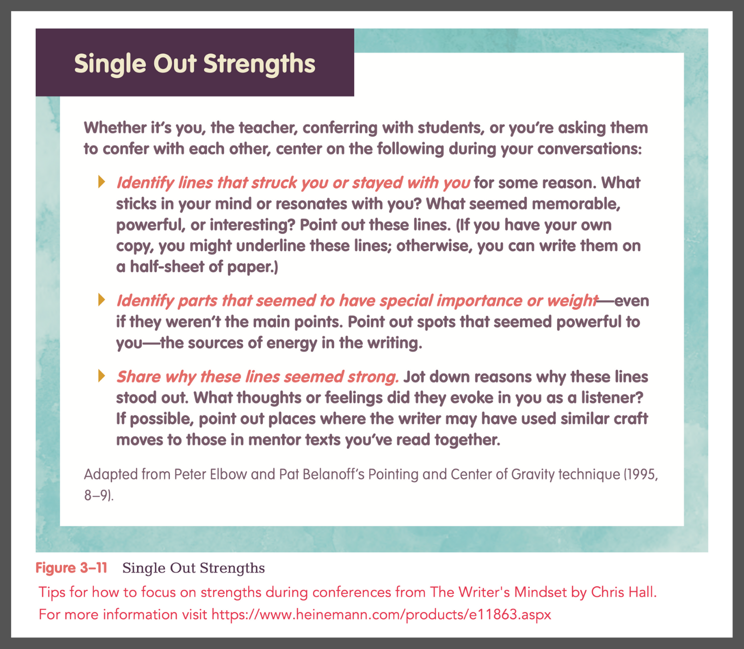 Dedicate some conferences to simply focusing on what’s working with your students’ writing—the knock-the-ball-out-of-the-park successes and even just the promising attempts and the “almost said.” Stay laser focused on the positives of a piece and avoid the temptation to stray off into the buts (“This piece has a great lead, but . . .”).