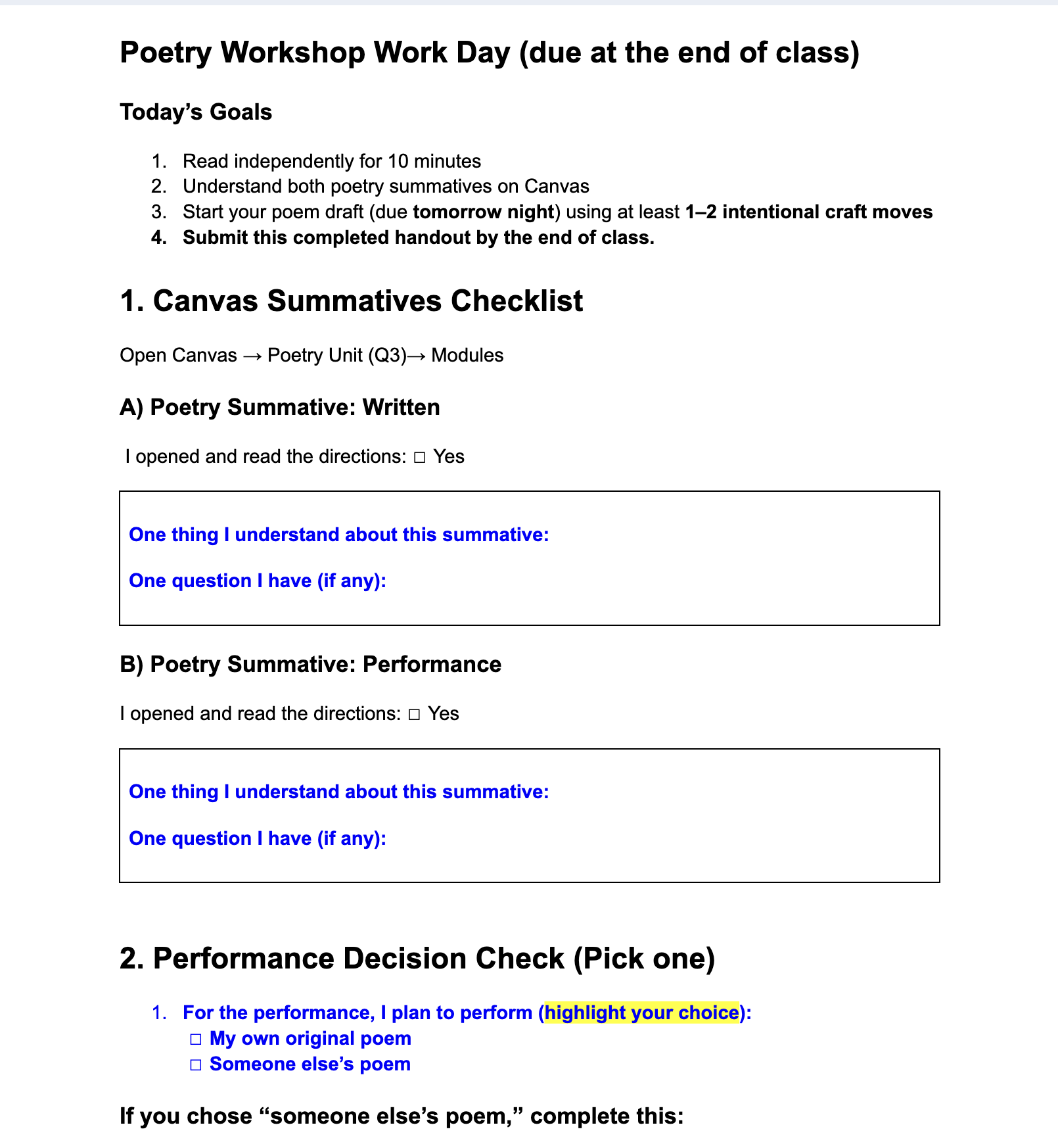 - Ask students to decide whether they'll perform their own poem or someone else's for the performance summative